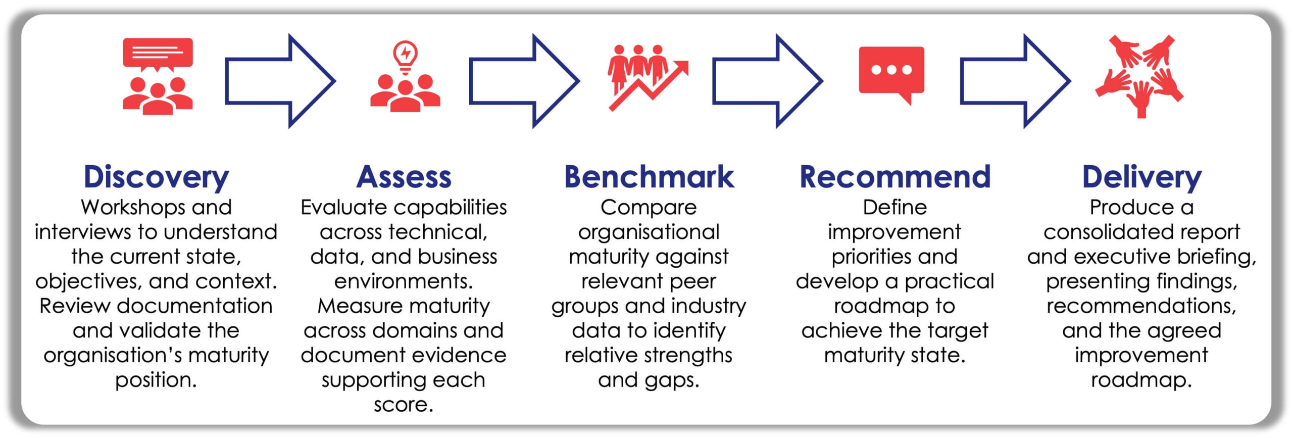 Through interviews, documentation review, and targeted validation, we assess capability and maturity across domains. - Maturity Scoring & Benchmarking